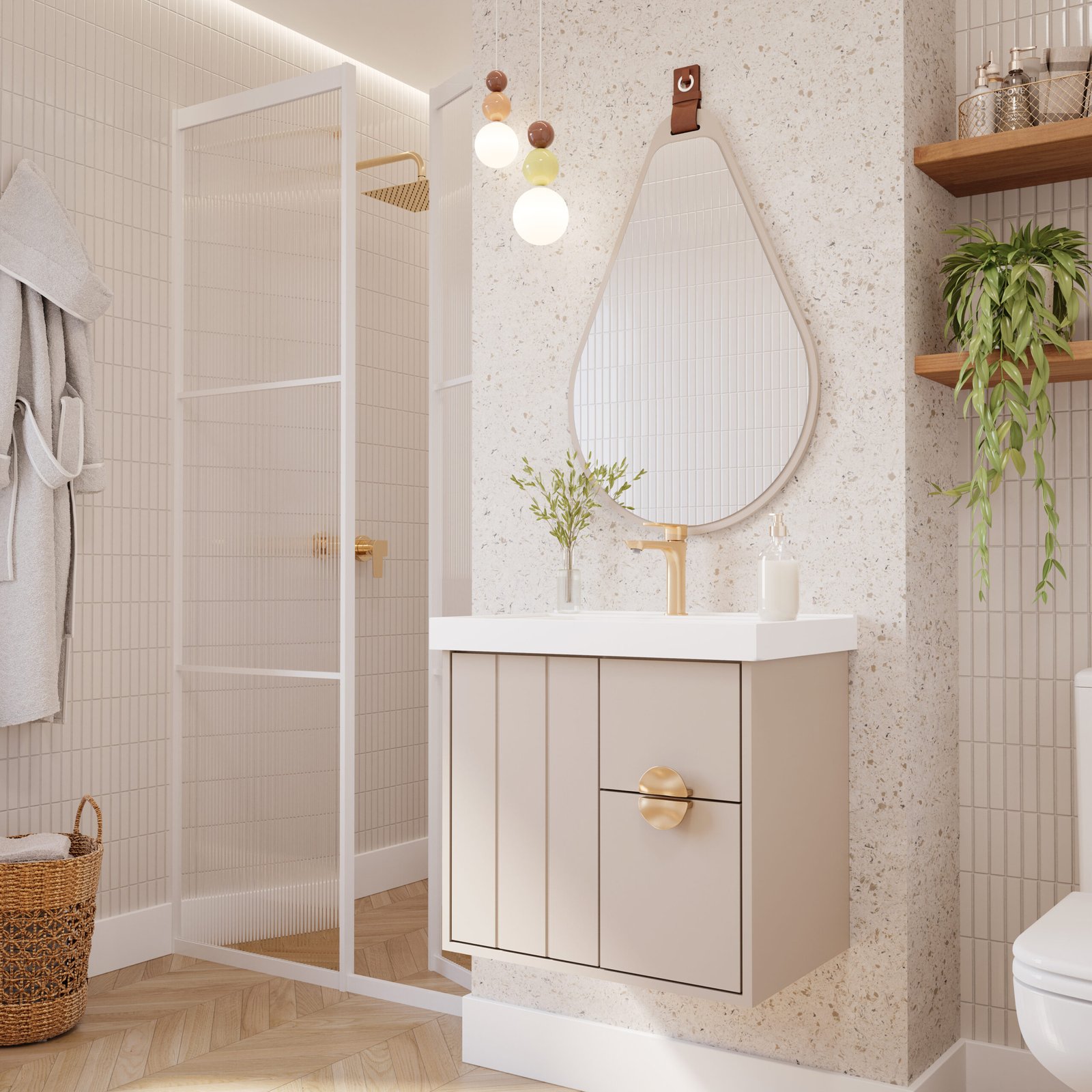As gavetas com corrediças telescópicas facilitam o acesso aos itens do dia a dia, e os puxadores em ABS na cor dourado fosco dão um toque de sofisticação. A cuba já vem inclusa, oferecendo um conjunto completo e pronto para o uso.